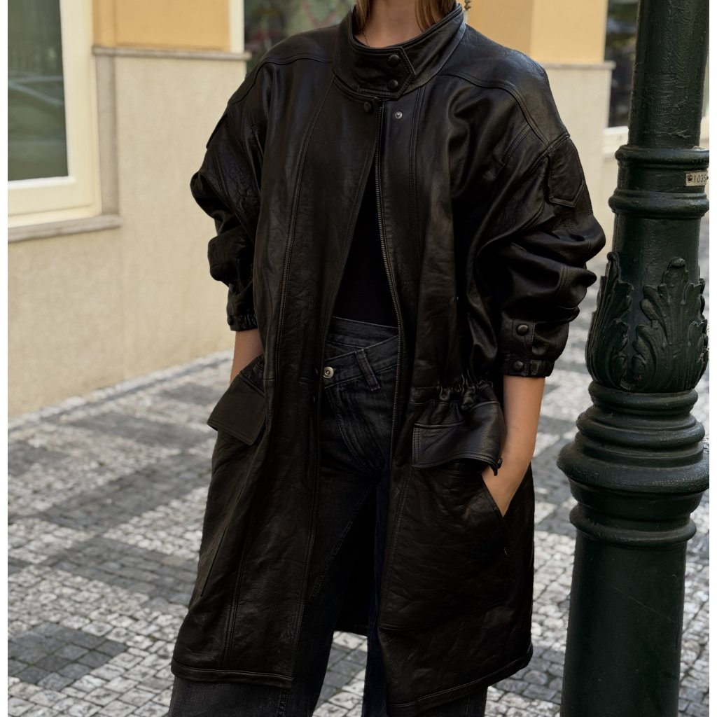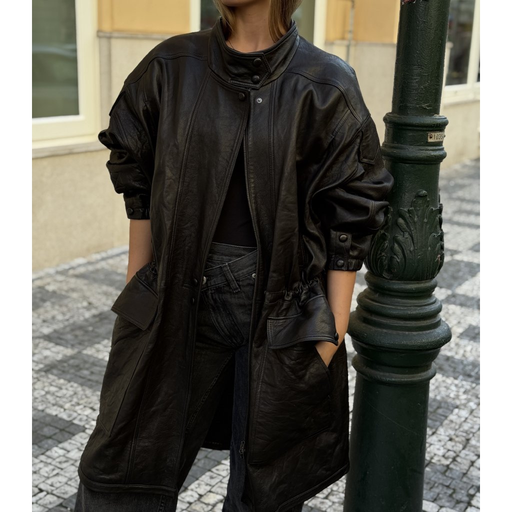 Ivana Mentlova kožená oversized parka. Vel. M oversized. Délka 99cm. Ramena 54cm. Šířka 100cm. Nošené minimálně.