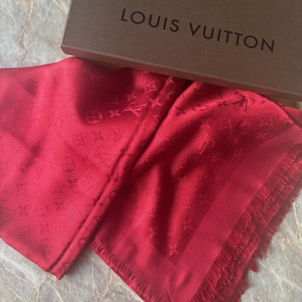 Louis Vuitton červený shawl Monogram. 140x140cm. Nošený.
