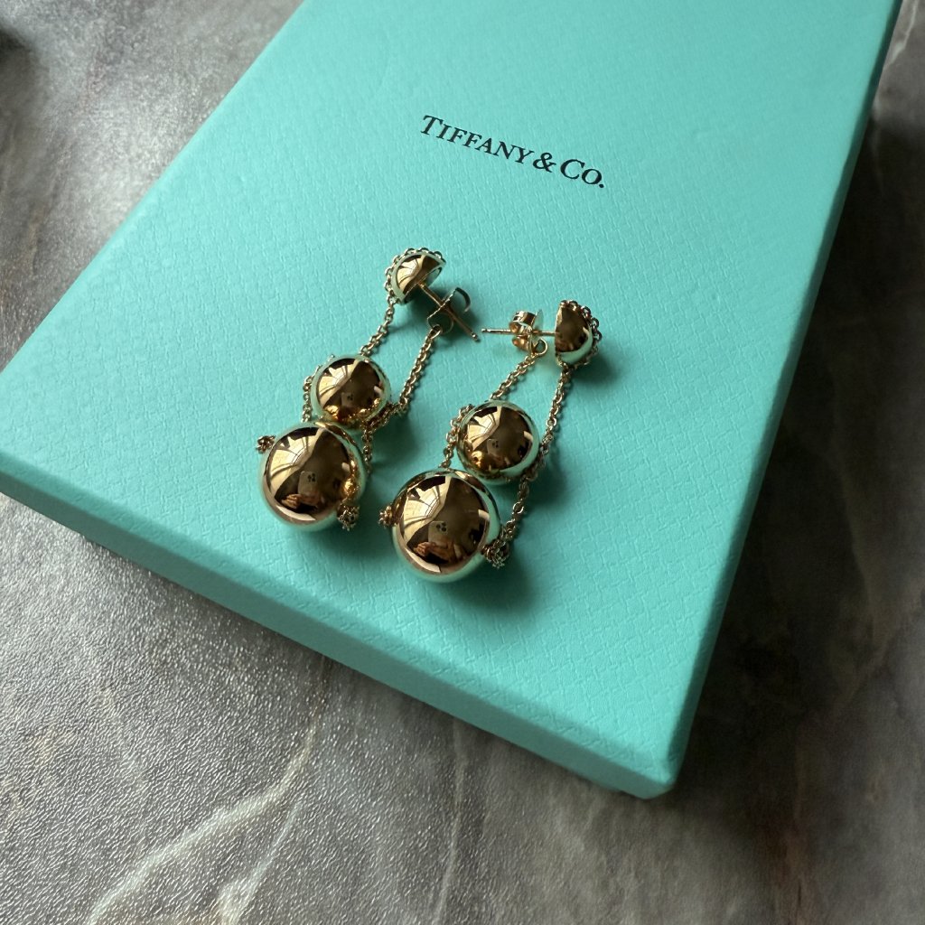 Tiffany & Co. zlaté visací Triple Drop náušnice. 6cm délka. Nošené, s účtem.