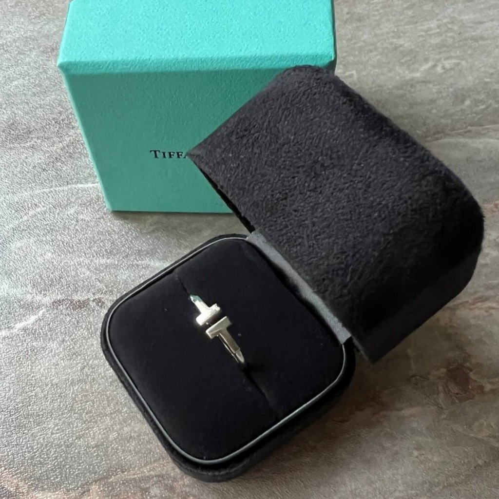 Tiffany&Co. zlatý T prsten. Bílé 18kt zlato. Vel. 52. Nošený minimálně.
